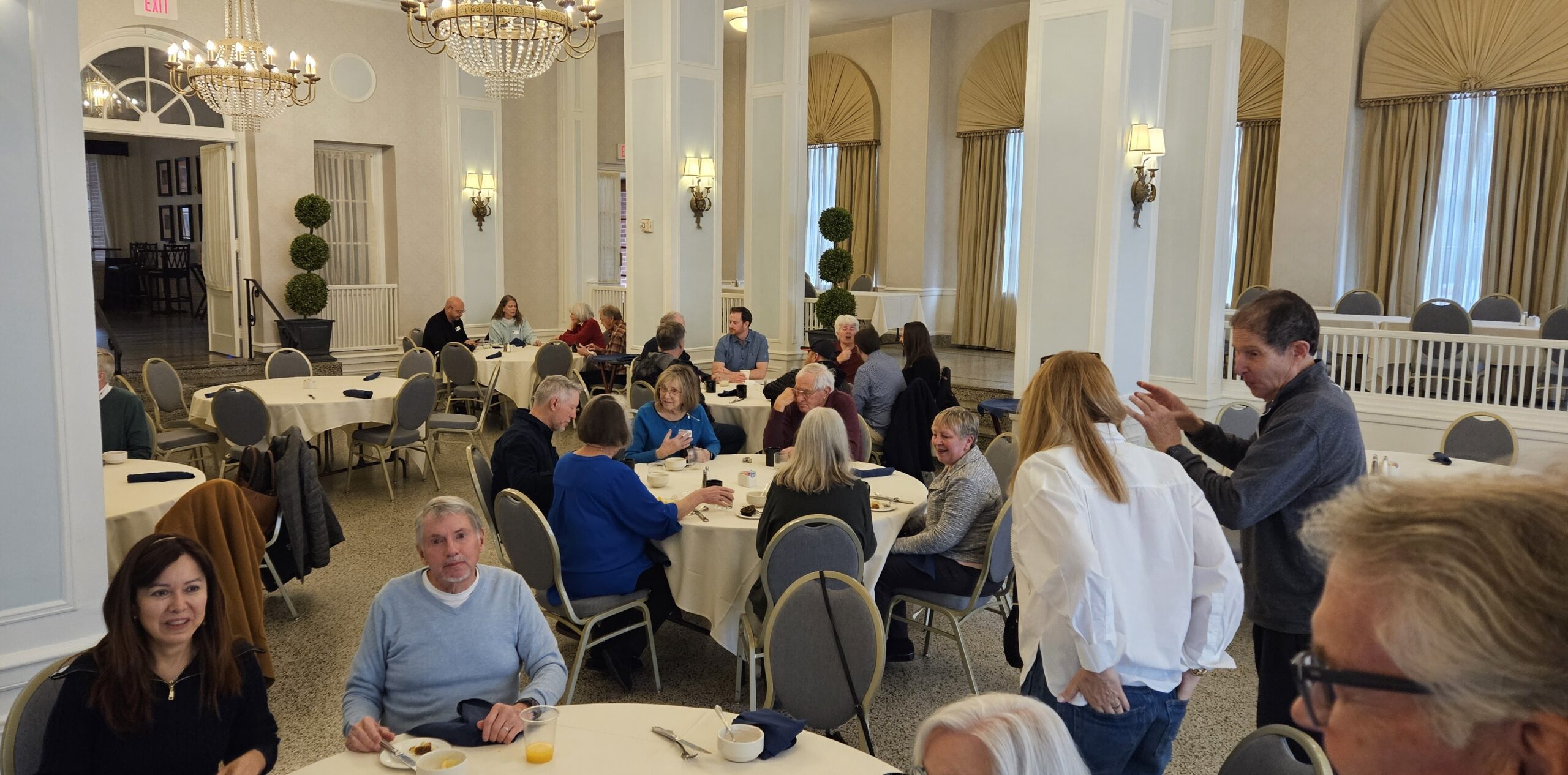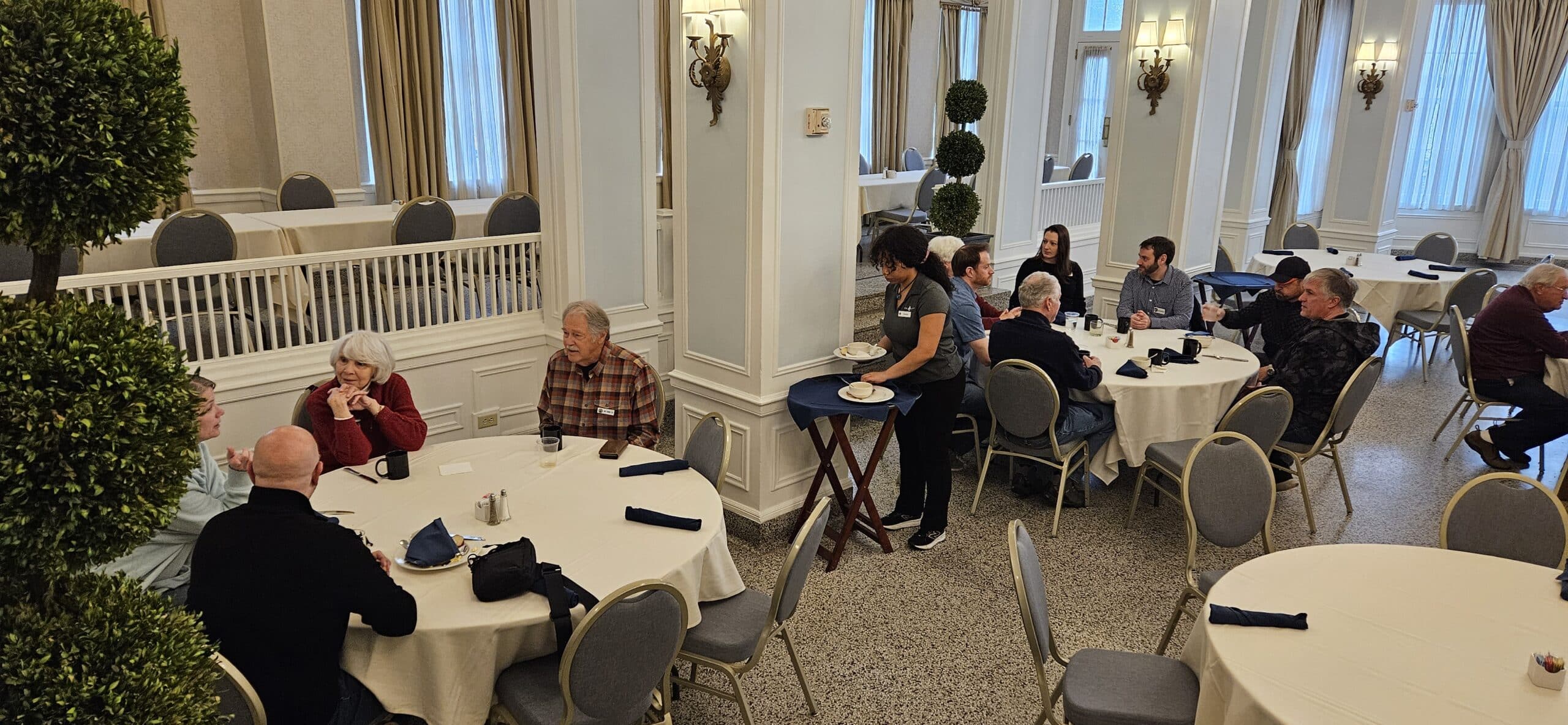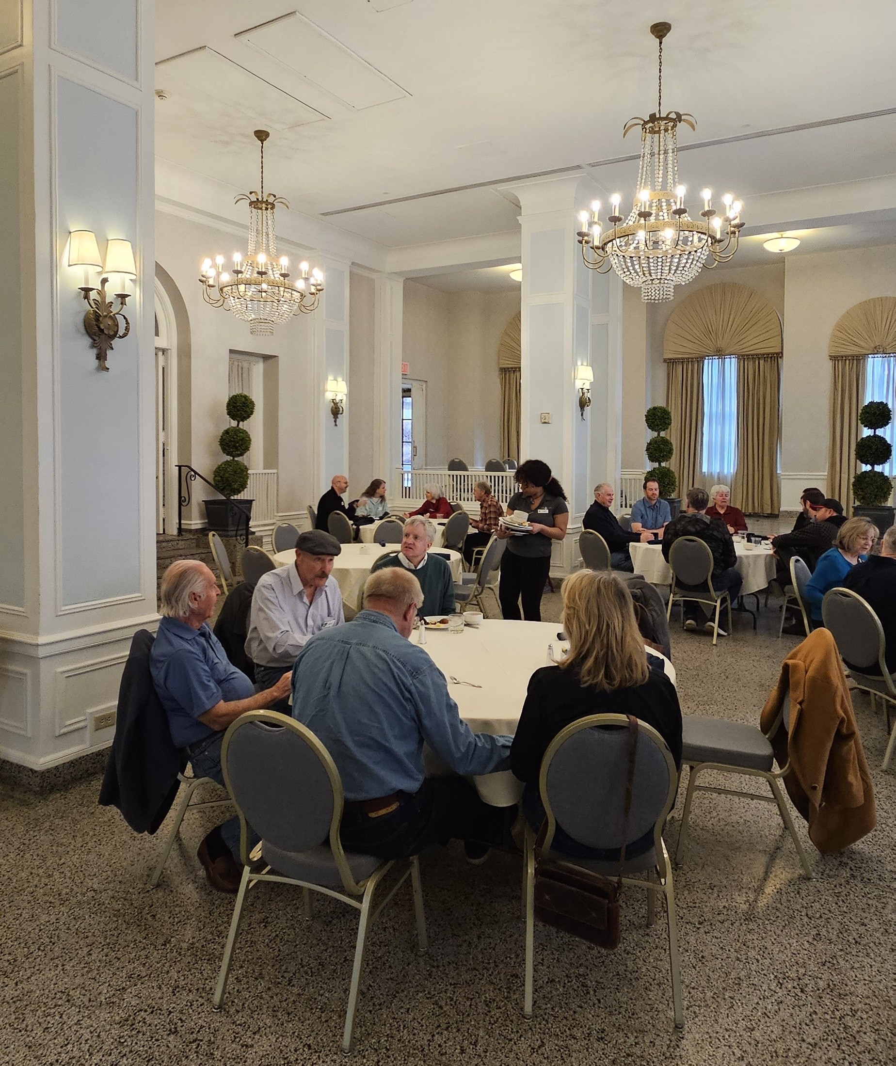 The following morning about 35 region members braved the huge wet snowflakes to return to downtown Staunton for a breakfast buffet in Hotel 24 South’s ballroom. After having their fill of delicious breakfast items, folks socialized with new and old friends. Sadly, the less than desirable weather prompted the cancellation of the planned after-breakfast drive around the southwestern portion of Augusta County. But look for a coffee shop gathering followed by the same drive to be announced for some time in the near future.
