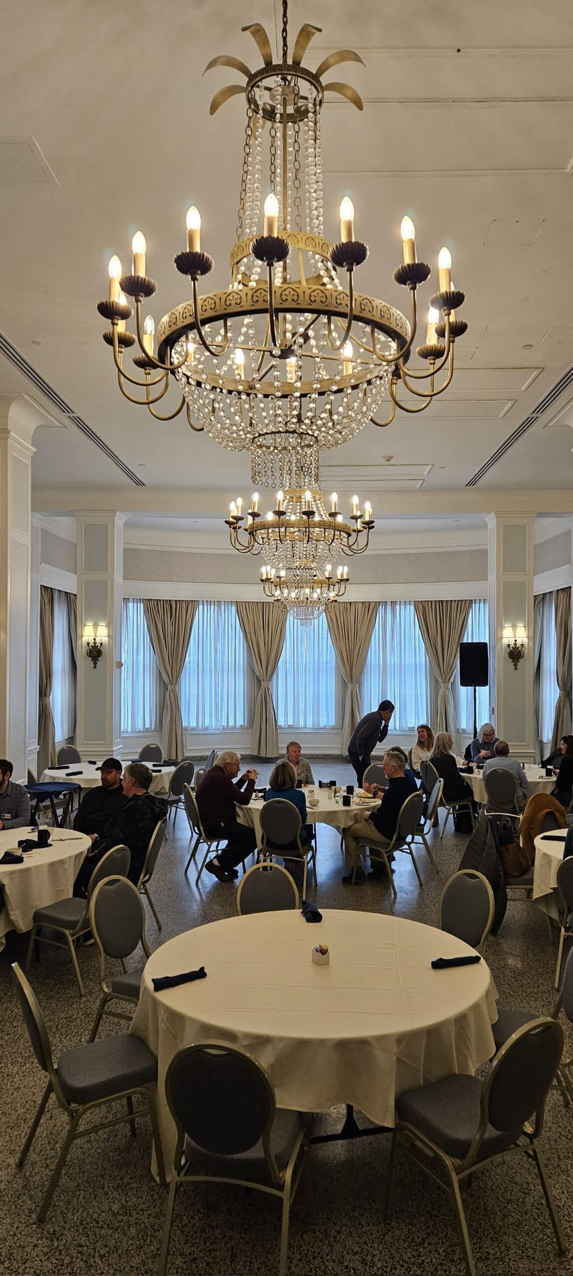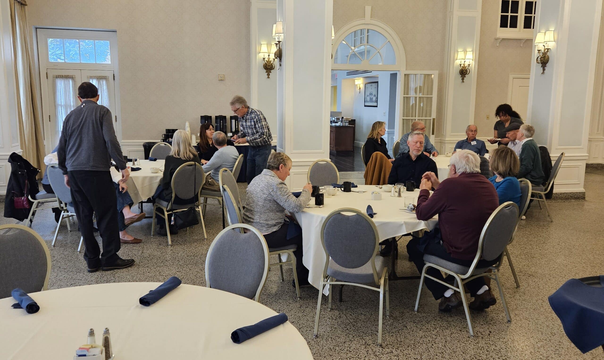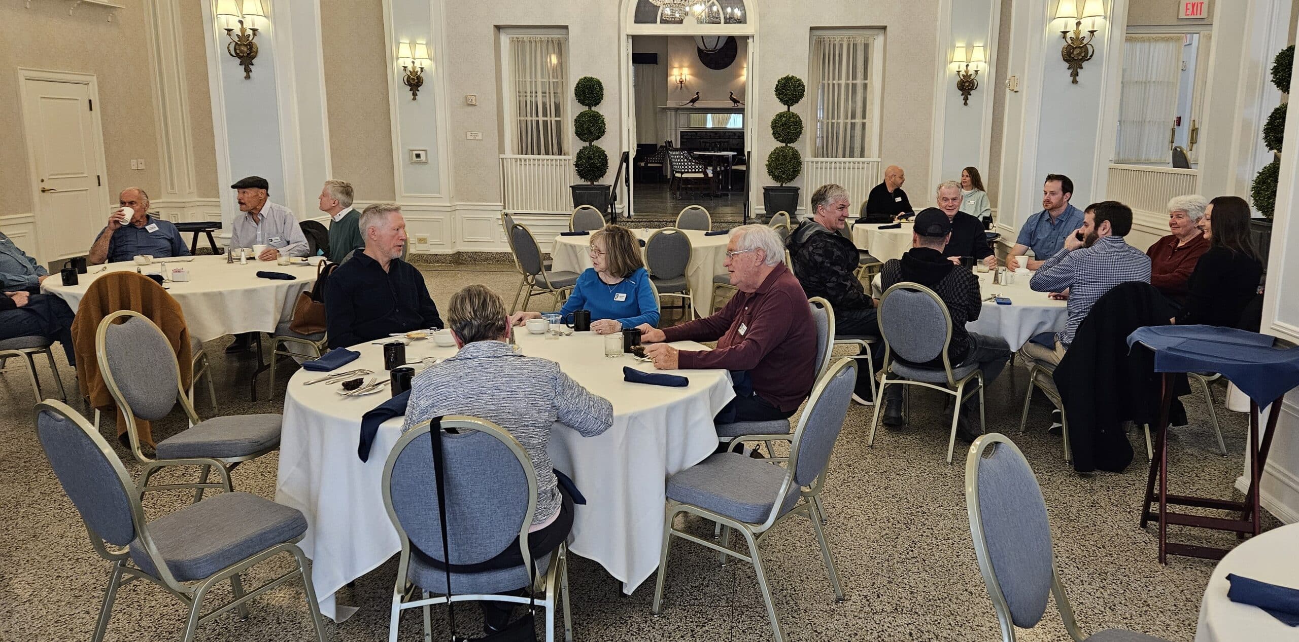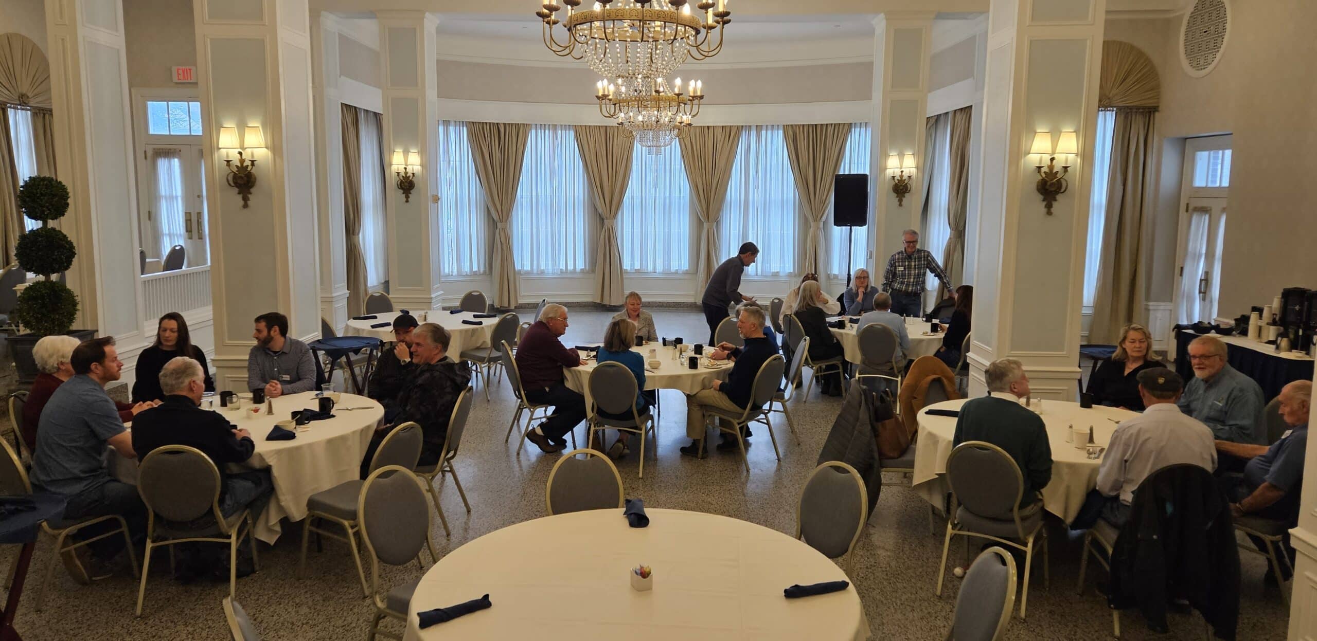 The following morning about 35 region members braved the huge wet snowflakes to return to downtown Staunton for a breakfast buffet in Hotel 24 South’s ballroom. After having their fill of delicious breakfast items, folks socialized with new and old friends. Sadly, the less than desirable weather prompted the cancellation of the planned after-breakfast drive around the southwestern portion of Augusta County. But look for a coffee shop gathering followed by the same drive to be announced for some time in the near future.